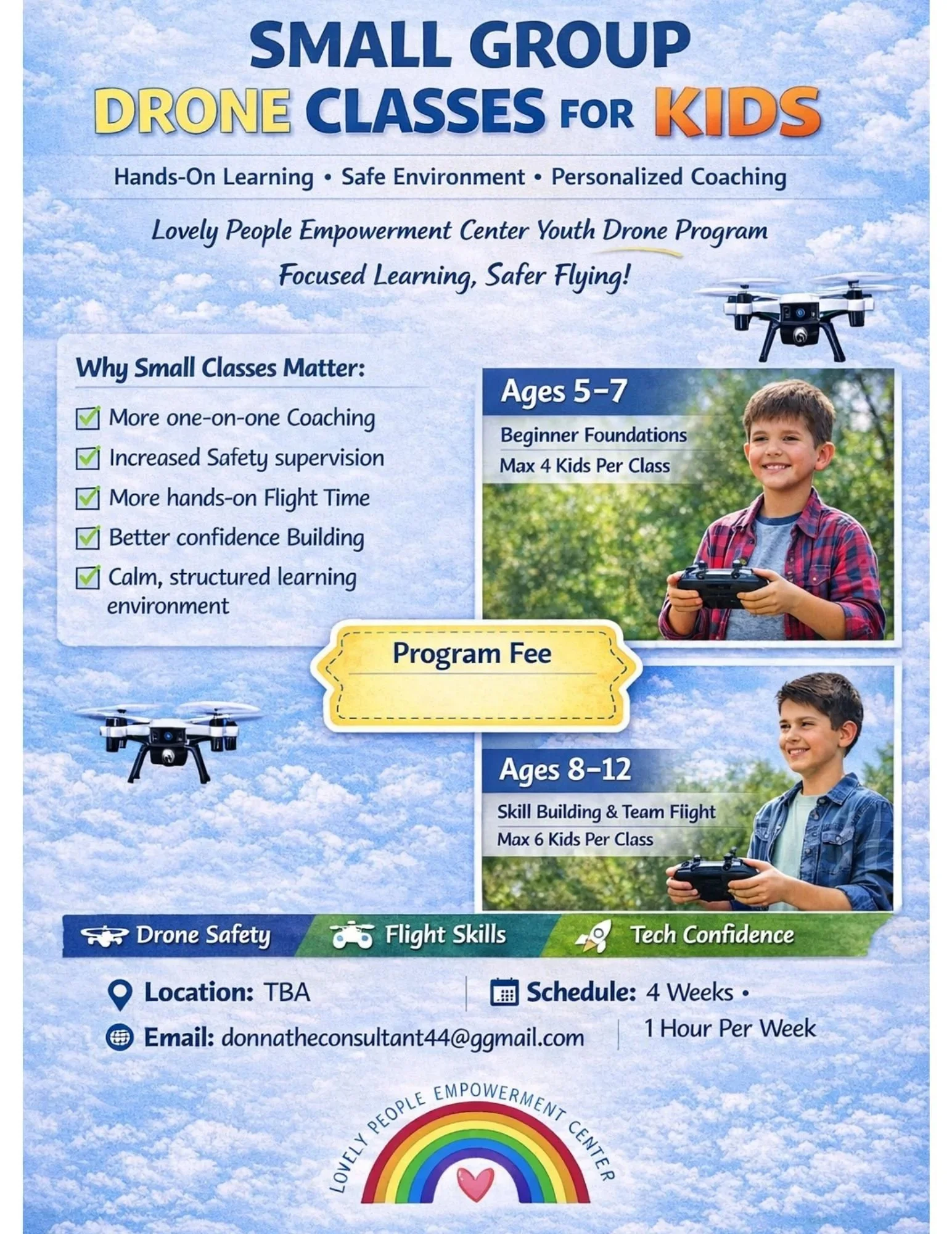 Our Youth Drone Training Program introduces children to the exciting world of drone flight in a safe and supportive learning environment. Through hands-on instruction, students ages 5-7 and 12-16 learn the basics of drone operation, safety awareness, and responsible flight while building confidence, focus, and technical skills. Small group classes allow each child to receive personalized guidance while exploring aviation concepts and future technology opportunities.